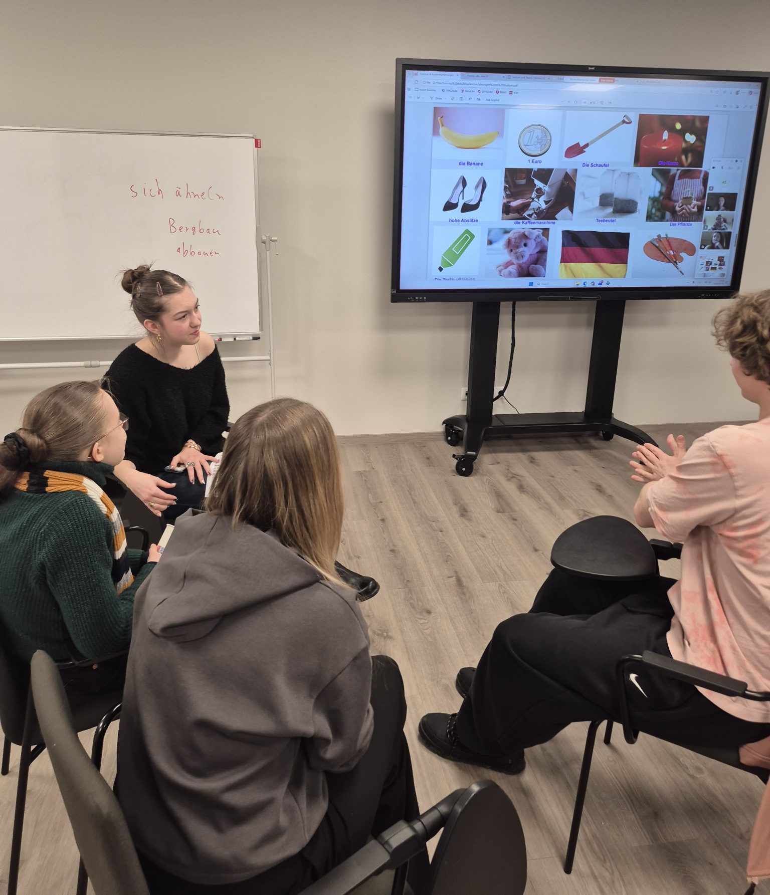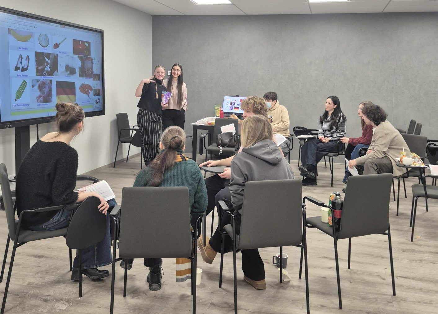 Every week, there’s an opportunity to improve your German and practice your conversational skills. Last week, we had a fantastic meeting at the Deutsch Club! We had the chance to prepare a presentation. First, we briefly introduced the topic “Erasmus and Study Abroad Experiences”, and then prepared some exciting discussion questions for our guests. Everyone worked in groups, both offline and online. After that, we played two fun games.The first was a role-playing game where participants had to imagine themselves in Erasmus situations and create dialogues. The second game involved choosing 5 important items out of 15 for an Erasmus experience and explaining why they were essential. Of course, delicious snacks were not missing.