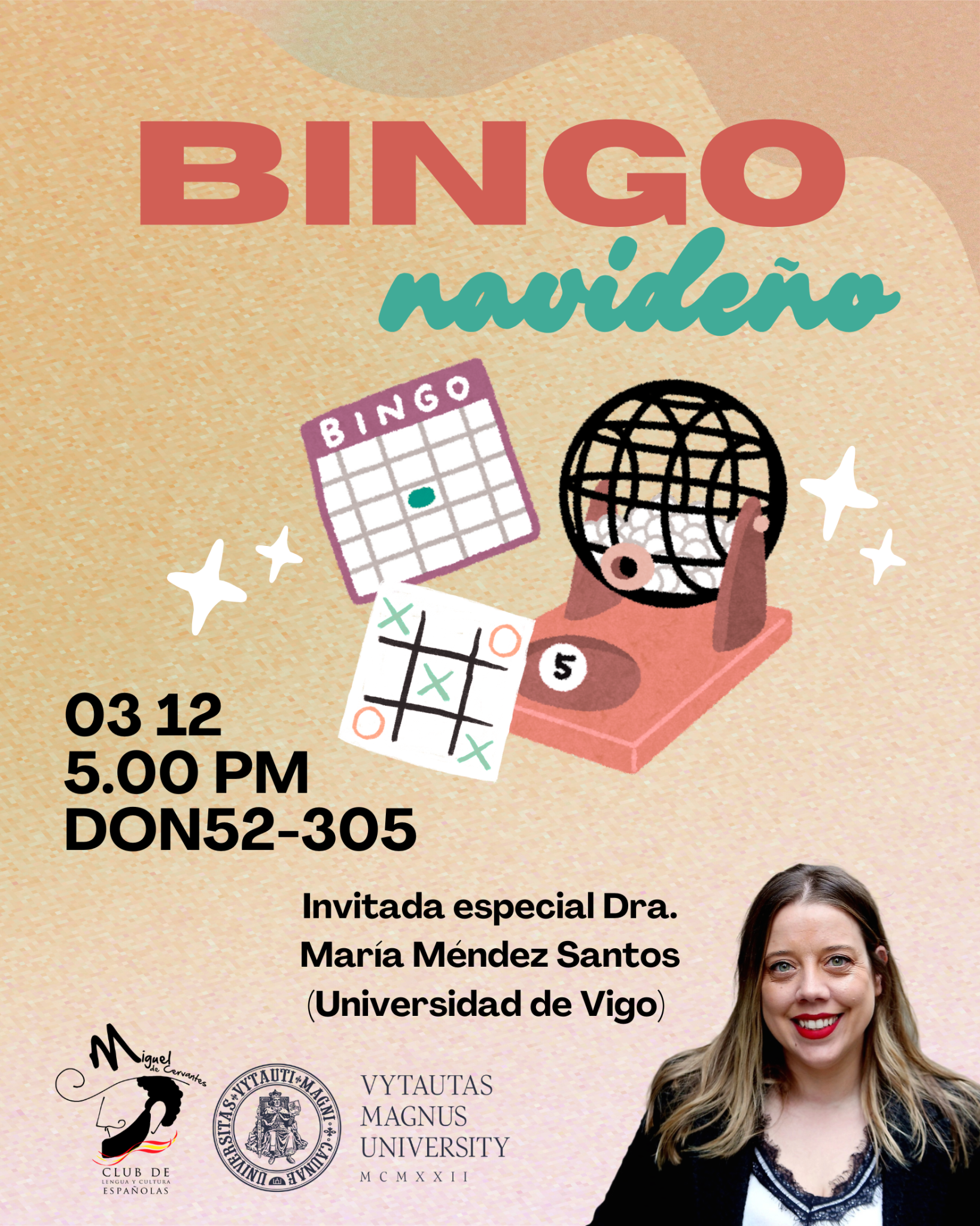 Gruodžio 3-ios vakarą Miguelio de Cervanteso ispanų kalbos ir kultūros klubas kviečia į jau tradiciniu tapusį Kalėdinį bingo vakarą (isp. Bingo navideño). Susirinkusiųjų lauks nuotaikingas bingo žaidimas, kurio metu bus galima pasikartoti skaičius ispanų kalba,  laimėti prizų ir sužinoti daugiau apie ispanakalbių šalių Kalėdų šventimo tradicijas.Vakaro viešnia – Vigo universiteto (Ispanija) lektorė dr. María Méndez Santos – skaitys paskaitą apie Kalėdų magiją Vigo mieste (isp. La Navidad mágica en Vigo). Taip pat bus ragaujami tradiciniai ispaniški Kalėdų skanėstai. Maloniai kviečiame dalyvauti!