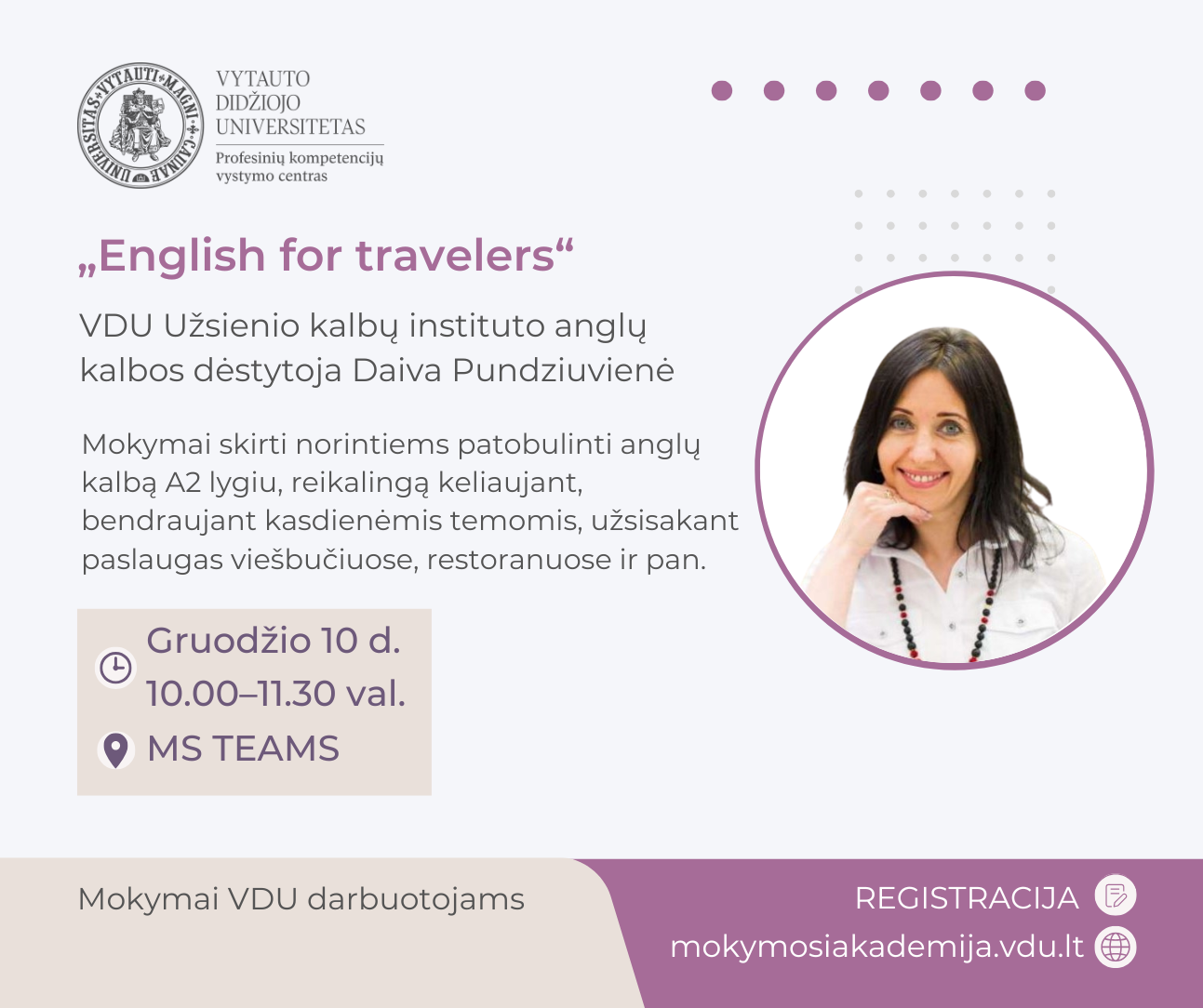 Gruodžio 10 d. 10.00–11.30 val. VDU darbuotojus maloniai kviečiame į nuotolinius mokymus „English for travelers“, kuriuos ves VDU UKI anglų kalbos dėstytoja Daiva Pundziuvienė.