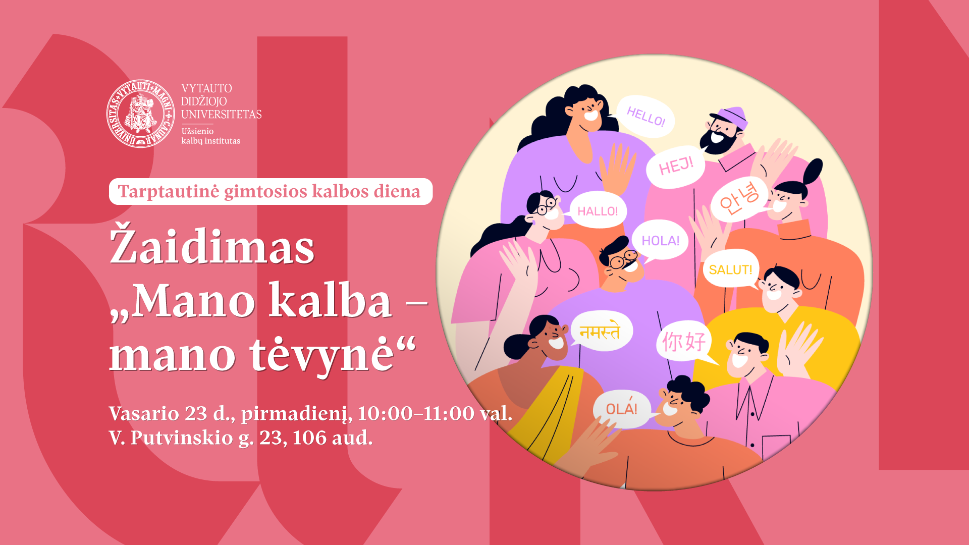 VDU Užsienio kalbų institutas kviečia Tarptautinę gimtosios kalbos dieną švęsti vasario 23 d., pirmadienį, 10:00-11:00 val., V. Putvinskio g. 23, 106 aud. Jūsų lauks žaidimas „Mano kalba – mano tėvynė“, kurio nugalėtojai bus apdovanoti prizais, įdomūs pašnekesiai su tarptautiniais studentais bei siurprizai! Švęskime kalbas, kultūras bei savo gimtąją kalbą!