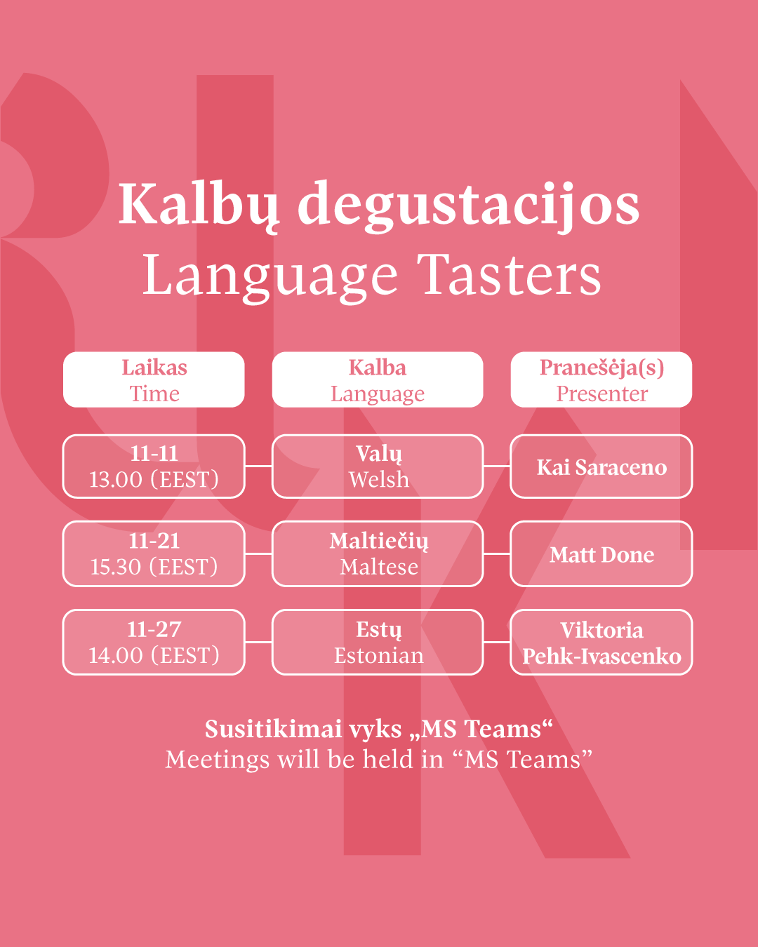 Šįkart daugiau sužinosime apie valų, maltiečių ir estų kalbas. Renginiuose, vyksiančiuose anglų kalba, gali dalyvauti visi, besidomintys kalbomis ir kultūromis, tad kviečiame dalintis renginio nuoroda su kolegomis, bičiuliais ir pažįstamais.